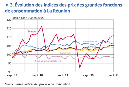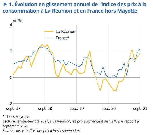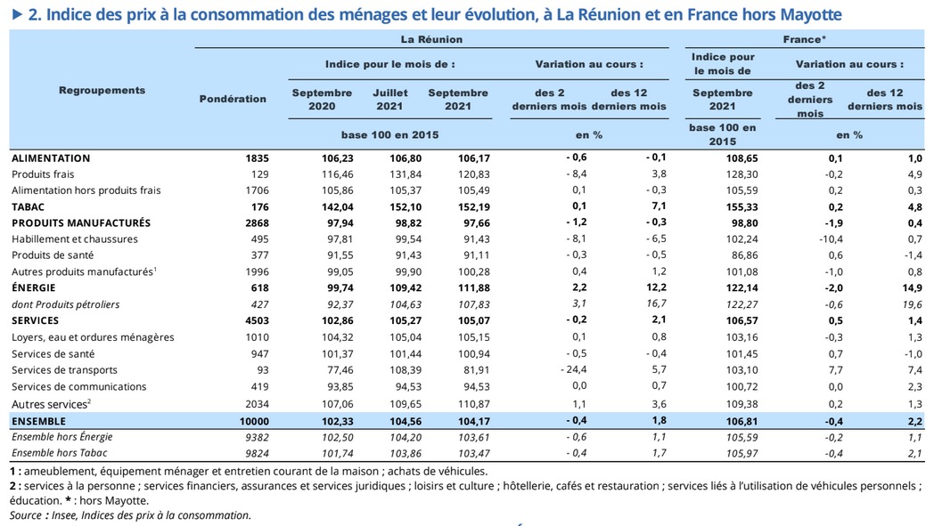 Les prix à la consommation des ménages reculent de 0,4 % entre juillet et septembre 2021 à La Réunion. Les prix des produits manufacturés baissent, comme ceux de l’alimentaire et des services dans une moindre mesure. À l’inverse, les prix de l’énergie augmentent. Les prix du tabac sont quasi stables. Sur un an, les prix augmentent de 1,8 % à La Réunion et de 2,2 % en France hors Mayotte.