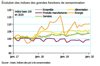 Les prix de l’alimentation augmentent de 1,2 % après un recul de 1,0 % en décembre. Les prix des produits frais rebondissent fortement : +12,6 % après avoir reculé de 12,4 % en décembre. Avec les fortes pluies de janvier, les légumes coûtent nettement plus cher, tout comme les fruits et le poisson. Hors produits frais, les prix de l’alimentation repartent aussi à la hausse (+ 0,3 %). La viande, les boissons non alcoolisées et les légumes surgelés notamment coûtent plus cher.