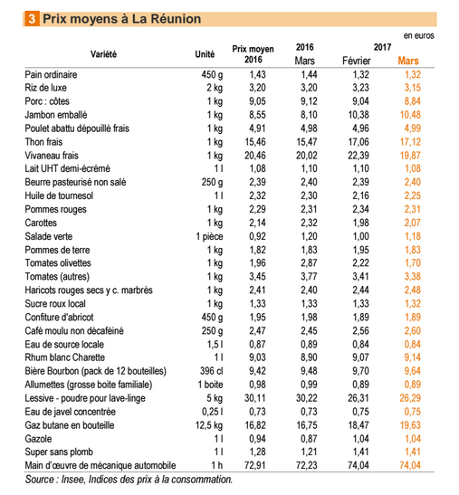 En mars 2017, les prix à la consommation augmentent de 0,2 % à La Réunion. L'augmentation des tarifs des transports aériens s'ajoute à la hausse des prix des assurances automobiles, des services de santé, des légumes frais et de la bouteille de gaz. À l'inverse, les baisses saisonnières de prix pour l'ameublement, les appareils ménagers et l'audiovisuel se poursuivent. Sur un an, les prix augmentent de 0,8 % à La Réunion et de 1,1 % en France.