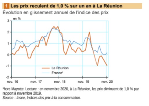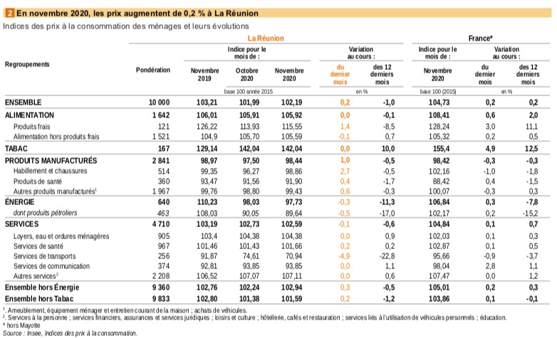 Les prix à la consommation des ménages augmentent de 0,2 % en novembre à La Réunion après deux mois de recul. Les prix augmentent pour les produits