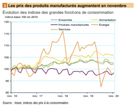Les prix des produits manufacturés rebondissent de 1,0 % en novembre après deux mois de baisse initiée par les soldes en septembre. C’est tout particulièrement le cas pour l’habillement et les chaussures (+ 2,7 %). La hausse est cependant moins forte que l’an dernier et les prix restent en dessous de ceux pratiqués au mois d’août.