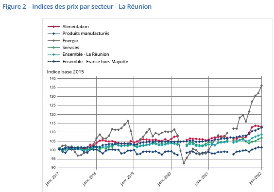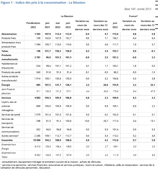 Ă La RĂ©union, lâaugmentation des prix sur un an est toujours marquĂ©e par le renchĂ©rissement des tarifs de lâĂ©nergie (+ 26,6 % sur un an en juin, aprĂšs + 23,3 % en mai et + 20,3 % en avril) qui se poursuit Ă un rythme soutenu, tirĂ©s par ceux des produits pĂ©troliers.