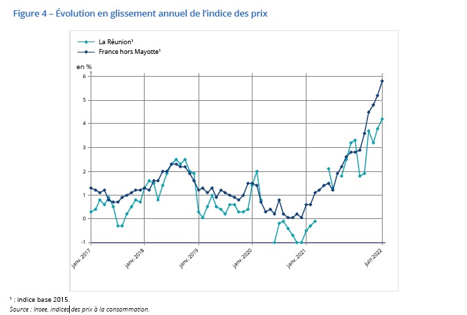 Sur un an, Ă La RĂ©union, les prix augmentent de 4,2 % (figure 3 et figure 4). Câest moins quâen France hors Mayotte oĂč la hausse sâĂ©lĂšve Ă 5,8 % : la hausse des prix sâaccĂ©lĂšre davantage quâĂ La RĂ©union pour les produits pĂ©troliers et dans une moindre mesure, pour lâalimentaire et les services.