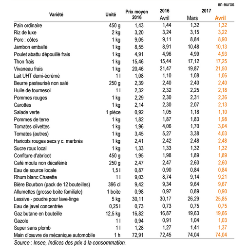 En avril 2017, les prix à la consommation augmentent de 0,7 % à La Réunion. Cette hausse est liée au rebond des prix des produits manufacturés après la période des soldes, ainsi qu'à la hausse des prix des produits frais et du tabac. À l'inverse, les prix de l'énergie sont en baisse. Sur un an, les prix augmentent de 0,6 % à La Réunion et de 1,2 % en France, selon les données de l'Insee dont nous publions le communiqué dans son intégralité ci-après.