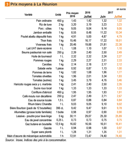 "En juillet 2017, les prix à la consommation augmentent légèrement de 0,1 % à La Réunion. La hausse saisonnière des prix des transports aériens, ainsi que des prix de l'alimentation hors produits frais, expliquent l'essentiel de cette augmentation. Elle est atténuée par la poursuite du recul des prix des produits pétroliers et des produits alimentaires frais. Sur un an, les prix baissent de 0,3 % à La Réunion, alors qu'ils augmentent de 0,7 % en France", selon le dernier bilan de l'Insee dont nous publions l'intégralité ci-après.