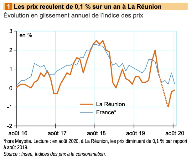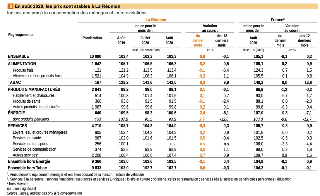 Au mois d'août 2020, les prix à la consommation sont stables à La Réunion. Les prix de l'énergie augmentent fortement : à la hausse des prix des produits pétroliers qui se poursuit depuis le déconfinement s'ajoute l'augmentation des tarifs de l'électricité. Dans le même temps, les prix des produits manufacturés augmentent légèrement. À l'inverse, les prix des services baissent - dont les tarifs aériens de saison -, ainsi que ceux des produits alimentaires dans une moindre mesure. Sur un an, les prix diminuent de 0,1 % à La Réunion et augmentent de 0,2 % en France hors Mayotte. Nous publions ci dessous le communiqué de l'INSEE. (Photo rb/www.ipreunion.com)