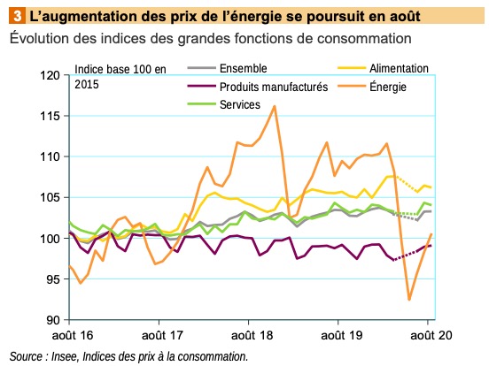 Les tarifs de l’énergie augmentent depuis le déconfinement, mais moins en août (+ 2,4 %) que les mois précédents (+ 2,8 % en juillet et + 3,4 % en juin). Les prix des produits pétroliers augmentent de 2,7 % après + 4,2 % en juillet, tirés par des hausses concomitantes des carburants et de la bouteille de gaz. Les tarifs de l’électricité augmentent également (+ 1,7 %) après cinq mois de stabilité. Les prix de l’énergie restent néanmoins en dessous de ceux pratiqués au début de l’année. Sur un an, les prix de l’énergie diminuent de 8,1 % à La Réunion, et de 7,1 % en France.