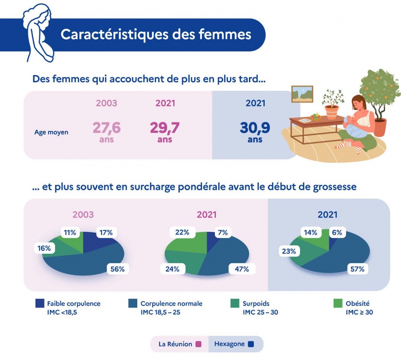 L’âge moyen des femmes ayant accouché en 2021 augmente (de 27,6 à 29,7 ans) et la part des trentenaires est devenue majoritaire (45%). Le niveau éducatif des mères a progressé par rapport à 2003 et l’écart avec l’Hexagone. Leur situation professionnelle a progressé (+6,6 points de femmes en activité en fin de grossesse).