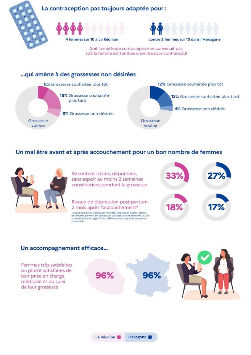 A la découverte de la grossesse, la réaction est positive pour deux femmes sur trois. Mais pour 23,7% des femmes, la grossesse n’est pas attendue, soit parce que ce n’est pas le bon moment (17,7%), soit parce qu’elle n’est pas voulue (6%). Ce taux de grossesses non désirées est supérieur à celui de l’hexagone (4%).