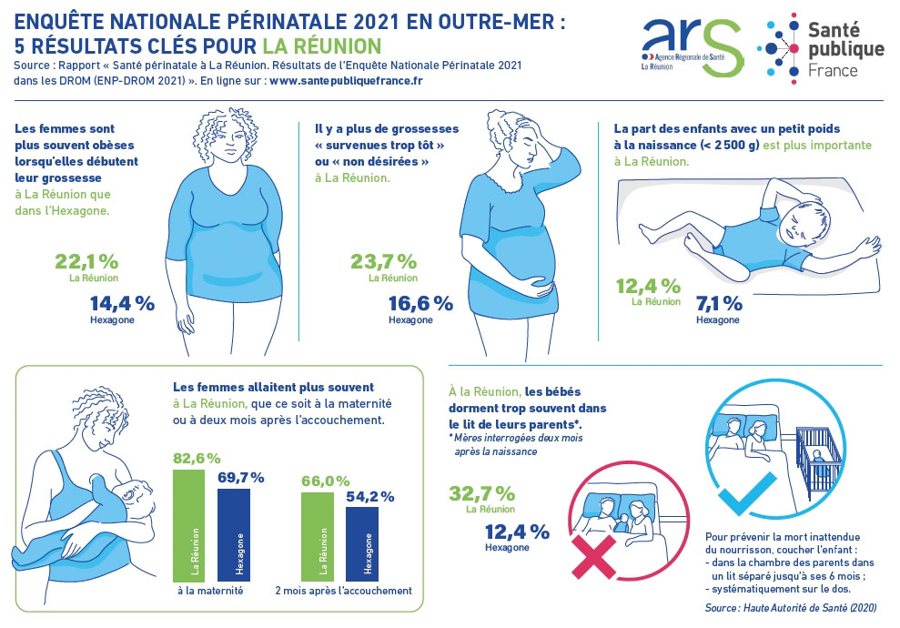 Menée dans l’Hexagone et dans tous les DROM (excepté la Guyane), l’enquête ENP-DROM 2021 s’est déroulée à La Réunion du 15 mars au 11 avril, dans les sept maternités de l’île et à la Maison de naissance de l’Ouest. "Le recueil des informations auprès des mères s’est déroulé à la naissance à la maternité, avec une sage-femme, et au téléphone ou par questionnaire en ligne 2 mois après la naissance de l’enfant" note l'ARS et et Santé publique France