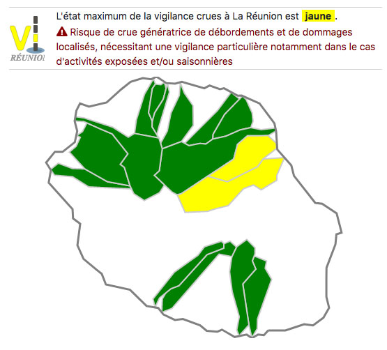 Ce mercredi 12 février 2020, en raison des pluies enregistrées dans l'est de l'île, les rivières des Marsouins et des Roches ont été placées en vigilance crues jaune. Ces cours d'eau sont gonflés par les fortes pluies qui s'abattent notamment sur la région est depuis le milieu de la nuit. La plus grande prudence est recommandée dans ces secteurs. De plus, avec le passage au nord de La Réunion de la dépression résiduelle Francisco, des orages en mer pourront toucher le nord et le nord-ouest. Météo France a d'ailleurs placé ces régions en vigilance orages jusqu'à 12 heures (Photo d'illustration rb/www.ipreunion.com)
