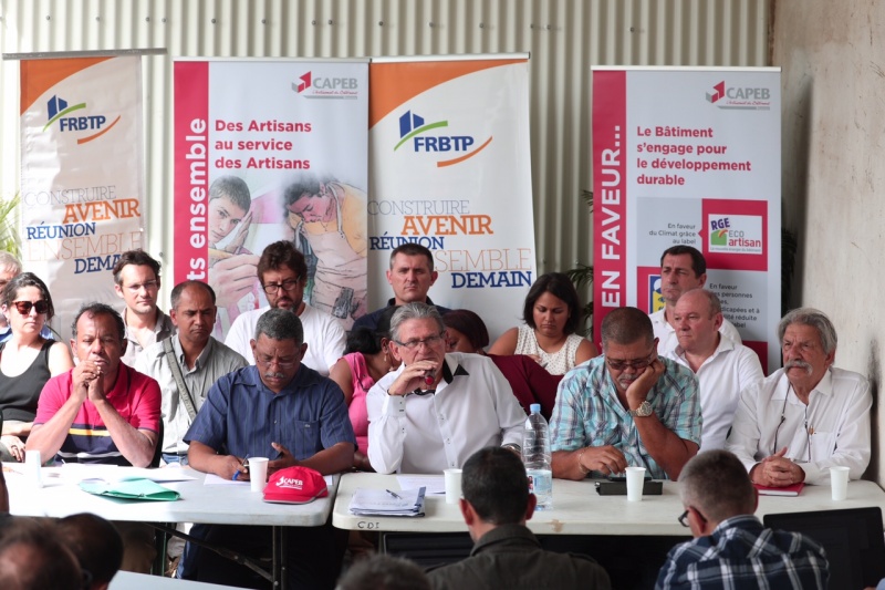 10 h 05 - Les présidents de la CAPEB, Cyril Rickmounie, et de la FRBTP, Bernard Siriex, s'installent l'un à côté de l'autre. Le secrétaire général de la CGTR BTP, Jacky Balmine se trouve à sa droite. Johnny Lagarrigue secrétaire général de la CFDT BTP et Jacques Houareau, du syndicat des architectes s'assoient aussi autour de la table.