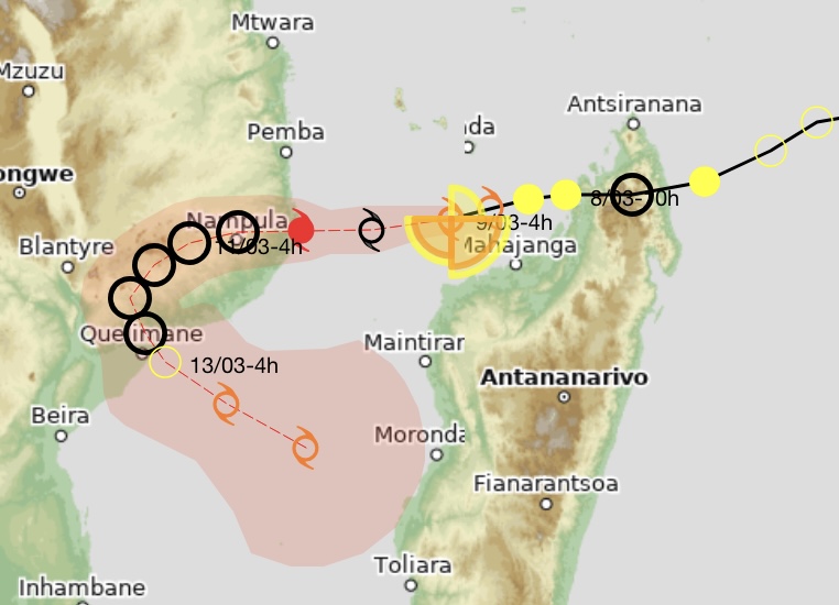 "Concernant le Mozambique et principalement la province de Nampula, un impact direct d'un système mature (cyclone tropical) est attendue en fin de nuit de dimanche à lundi à proximité de Ilha de Mocambique. Les conditions se dégradent actuellement avec de fortes pluies, des vents forts arriveront en cours de journée de dimanche. Au moment de l'impact, les vents atteindront le seuil très probable de très destructeurs proche de la zone d'impact. La mer sera dangereuse avec risque de submersion marine proche de la zone d'impact", alerte Météo France