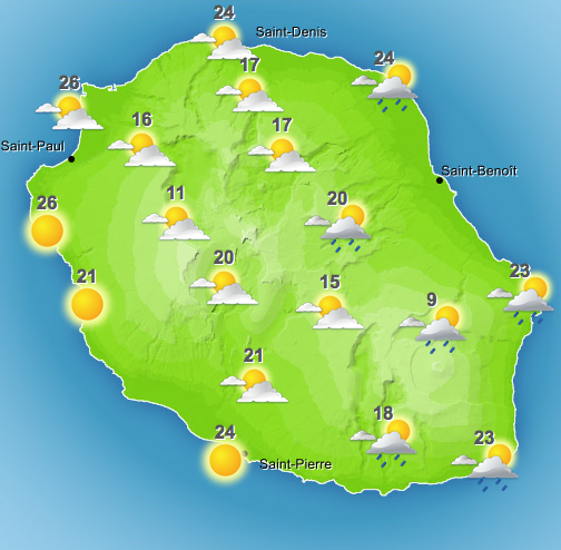 Après la pause de la veille, une nouvelle période humide se dessine sur l'île. Les traits essentiels du temps se résument à un ciel bien nuageux, temporairement pluvieux sur l'Est.