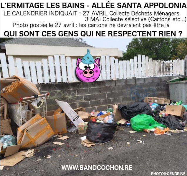Ce samedi 28 avril 2018, le collectif "Band Cochon" a publié une photo de déchets sur la voie publique à l'Hermitage. Le cliché a été pris le 27 avril et montre un non-respect du calendrier des collectes. Par ailleurs, les cartons sont éparpillés sur le trottoir.