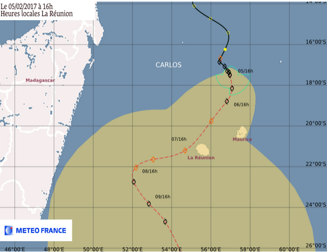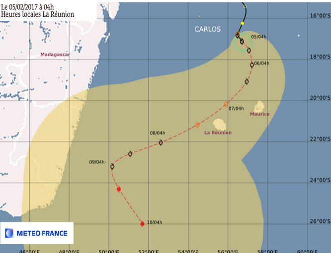 A 7h00 ce dimanche 5 février 2017, la forte tempête tropicale Carlos se trouvait à 420 km des côtes réunionnaises, au nord-nord-est de La Réunion par les points 17.3 sud et 56.8 est. Le système s'est renforcé et a atteint le stade de forte tempête tropicale dans la nuit de samedi à dimanche. Il se déplace à la vitesse de 7 km/h le long d'une trajectoire sud-est qui le rapproche de l'île. Fortement arrosée, notamment dans l'ouest, depuis ce samedi, La Réunion est toujours est toujours en pré-alerte cyclonique.
