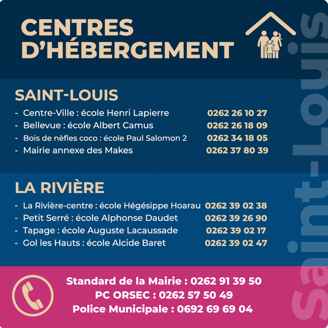 La ville du Port informe les administré.e.s de l'ouverture de deux centres d'hébergement : le complexe Sportif Municipal (CSM) - 14 rue Sans Soucis et le gymnase de la Rivière des Galets - Rue Jacques Duclos. Un numéro d'appel unique a d'ailleurs été mis en place : 0262 42 87 00. Le communqiué de la ville du Port est disponible ici -
