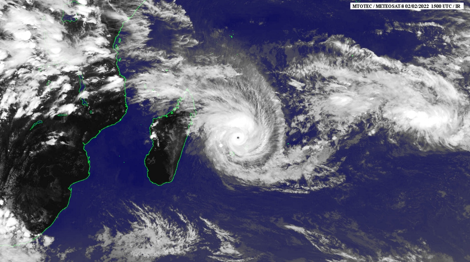 Une idée de la taille du #cyclone #Batsirai qui touche actuellement l'île #Maurice et l'île de la #Réunion où on y a déclenché l'alerte cyclonique rouge avec la consigne "Je me confine" dès 19h heure locale. Crédit photo @LadiLafeFR sur Facebook. pic.twitter.com/Nvc0fSDmdV