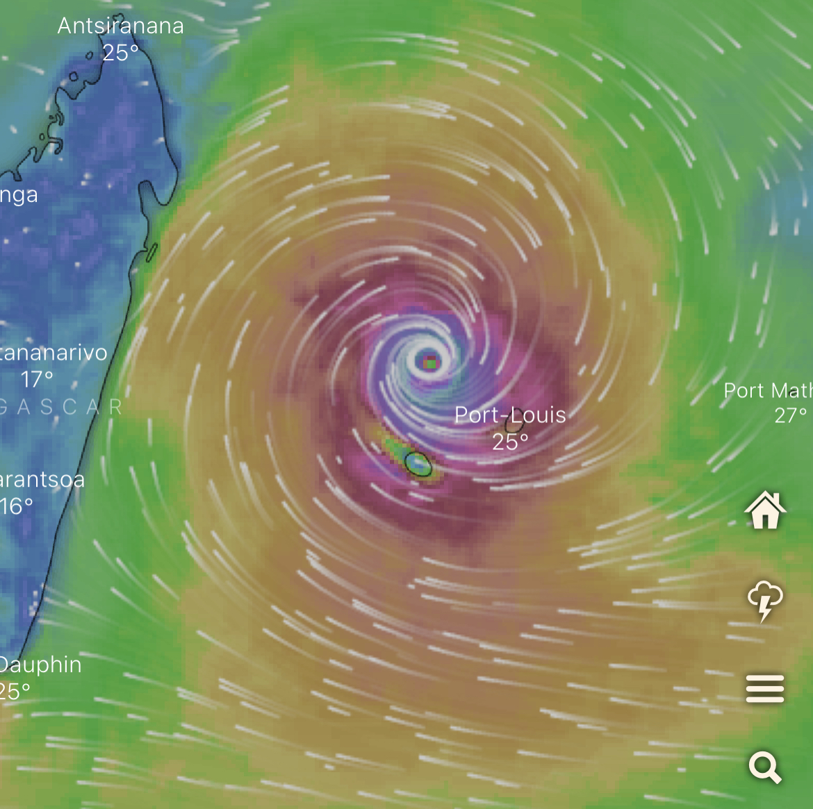Batsirai étant un sytème de petit diamètre, le vent maximal se trouve dans un rayon de 30 km autour du centre, précise la Mauritius Meteorological Services
