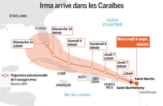 Selon le National Hurricane Center (NHC) américain, Irma devrait ensuite progresser vers Cuba, puis la Floride, qu'il devrait toucher en toute fin de semaine.