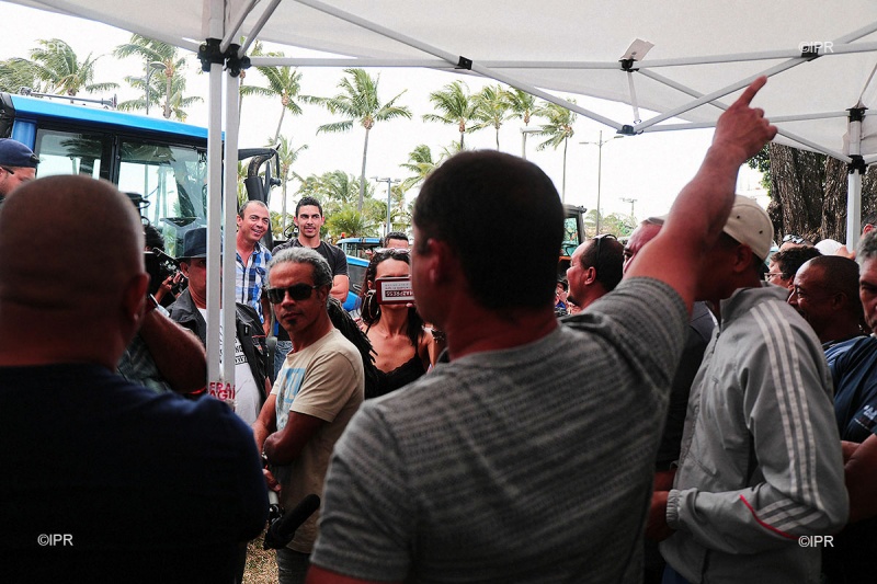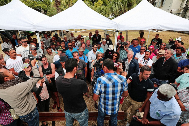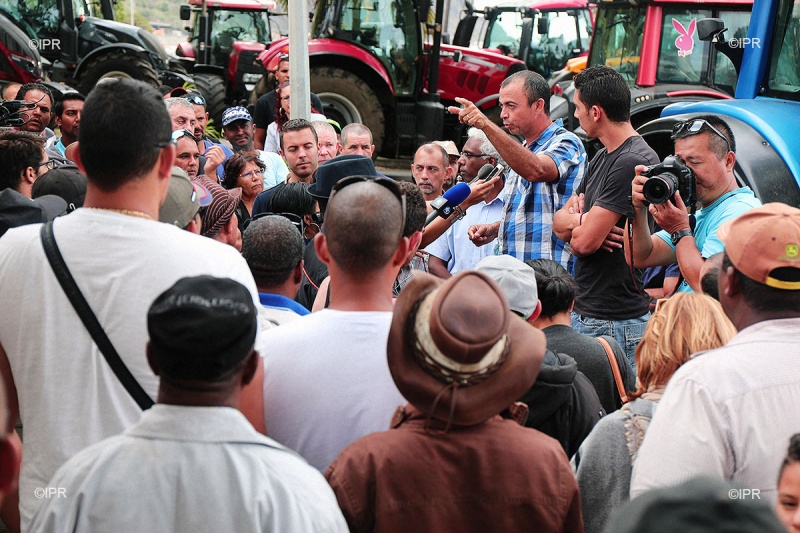 • 15h20 - Les délégués syndicaux de la FDSEA et de JA sont arrivés au Barachois. La CGPER n'est pas présente. Frédéric Vienne s'adresse aux planteurs. Il rappelle les principales revendications des planteurs : la sauvegarde de leur pouvoir d'achat et l'intéressement à la vente du sucre.