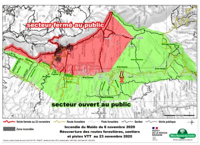En raison de l’incendie toujours pas déclaré éteint sur le massif du Maïdo, la route forestière du Maïdo, pour sa portion entre le croisement avec la RF des Tamarins et son terminus au sommet du Maïdo (RF 8), est interdite à tous véhicules motorisés ou pas et quel que soit le nombre de roues, aux chevaux ainsi qu’à tous piétons, jusqu’à nouvel ordre.