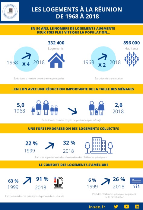 Le nombre moyen de personnes par ménage est ainsi passé de 5,0 en 1968 à 2,6 en 2018. Du fait de la très forte hausse du nombre de logements en 50 ans, le parc des logements est nettement plus récent à La Réunion qu’en France métropolitaine. La maison individuelle reste majoritaire, mais le logement collectif sedéveloppe sensiblement. Le confort des logements s’améliore également fortement sur la période.