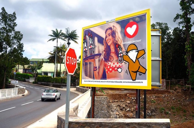 Une jeune fille tout sourire, portant un plateau avec une bouteille de soda. Et tout près d'elle, un petit gouzou dansant, tenant à la main une même bouteille. Le détournement du panneau publicitaire a été effectué par l'artiste Jace, au détour d'un virage au 12ème kilomètre, au Tampon. Ce qui a ravi ses fans : la publication a été likée plus de 2000 fois, et les commentaires se réjouissent de ce graff insolite.