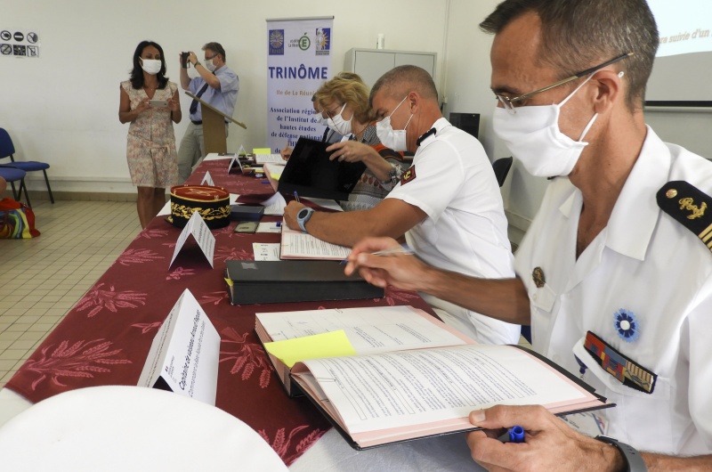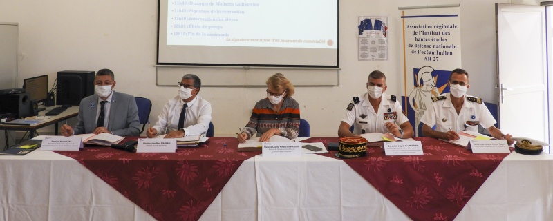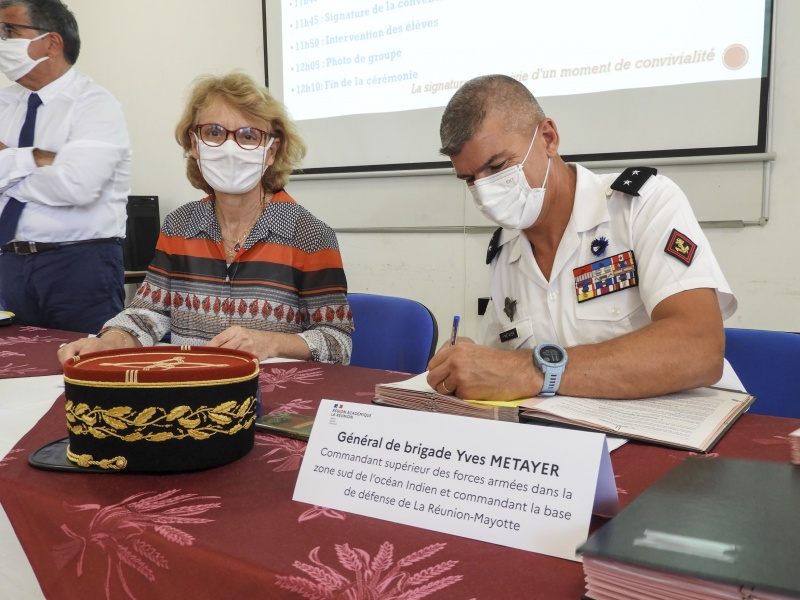 La convention comporte les signatures des autorités du trinôme académique: le général Yves Metayer, commandant supérieur des FAZSOI, madame Chantal Manès-Bonnisseau, rectrice de l’Académie de La Réunion et Monsieur Bernard Hay, président de l’association régionale de l’IHEDN. Le capitaine de vaisseau Arnaud Paquet, commandant de la base navale du Port-des-Galets et monsieur Jean-Marc Spampani, proviseur du lycée ont également signé cette convention qui officialise plus précisément la collaboration entre la Marine Nationale et ce lycée du Port.