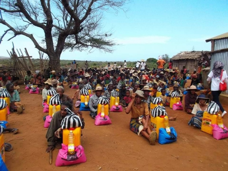 Dans le sud malgache, 600 paniers garnis ont été distribués vendredi 13 et samedi 14 novembre 2020. La lutte contre la famine dûe au kere continue. Plusieurs familles victimes d'insuffisance alimentaire ont été assistées. Chaque week-end les équipes bénévoles s'activent pour continuer la distribution alors que la plateforme de dons Agir pour Mada est toujours active. (Photo : Agir pour Diego)