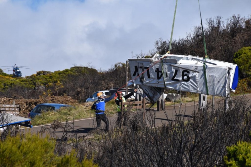 A la suite du crash mortel de l'ULM survenu le dimanche 10 octobre 2021 vers 08h30, s'est déroulée ce jeudi l'opération d'extraction de l'épave de l'aéronef. Quatre gendarmes du PGHM, héliportés sur zone par la section aérienne gendarmerie de Saint-Denis, ont mené les opérations suivantes : la mise en place du matériel et des "Helpeurs" d'Hélilagon par les gendarmes du PGHM sur le rempart à 7h, la préparation de l'épave, la récolte des éléments du crash dans un Bigbag, les actes d'enquête et prises de clichés photographiques ; le levage de l'épave et des bigbags par un hélicoptère d'Hélilagon requis par la gendarmerie sur autorisation du parquet de Saint-Denis, qui a déposé à la plateforme du piton du Maïdo. L'épave ainsi que des éléments du crash ont été évacués vers Cambaie avec escorte gendarmerie (Photo PGHM)