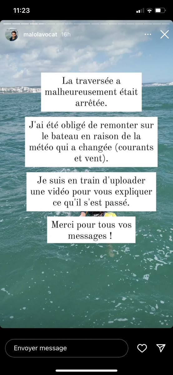 Dans une story publiée sur le réseau social Instagram, le nageur a fait part de sa déception suite aux mauvaises conditions météo, qui l'ont contraint d'abandonner la traversée. Il tient à remercier ses supporters . "La traversée est déjà finie après 4 heures de nages. Je n'ai pas pu aller jusqu'au bout. Pendant les deux première heures, la météo était correcte puis après je me suis pris les courants beaucoup trop forts, en plus du vent. Il n'y a rien à faire. Le vent a changé de sens au dernier moment. Quand c'est l'homme contre la nature, c'est la nature qui gagne... Le courant m'aurait emporté. C'est comme ça c'est la vie. C'est un abandon forcé", explique-t-il dans sa vidéo.