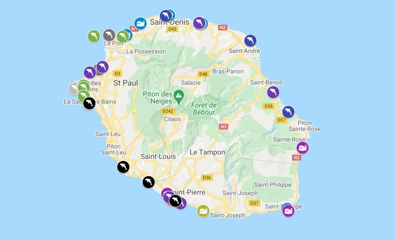 La carte recense les principaux échouages connus et/ou constatés à La Réunion par Globice depuis 1993.