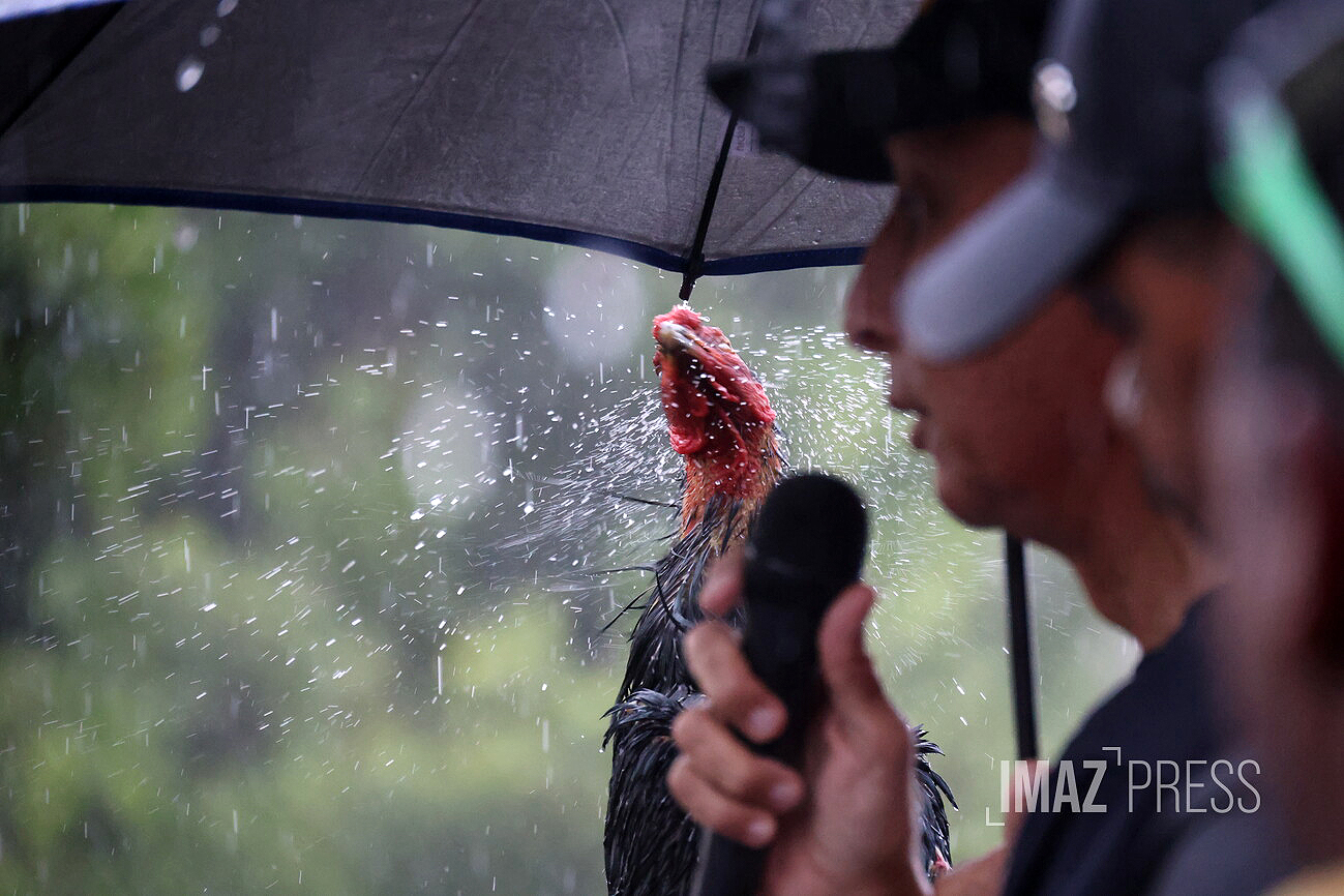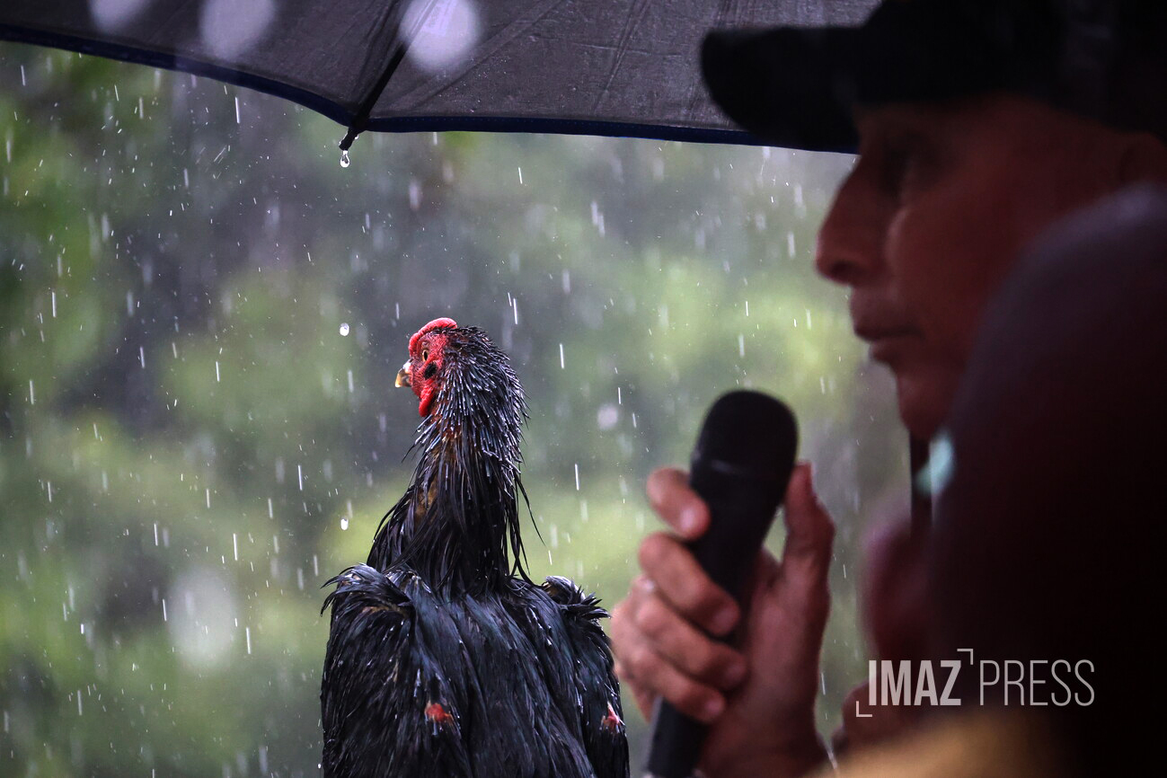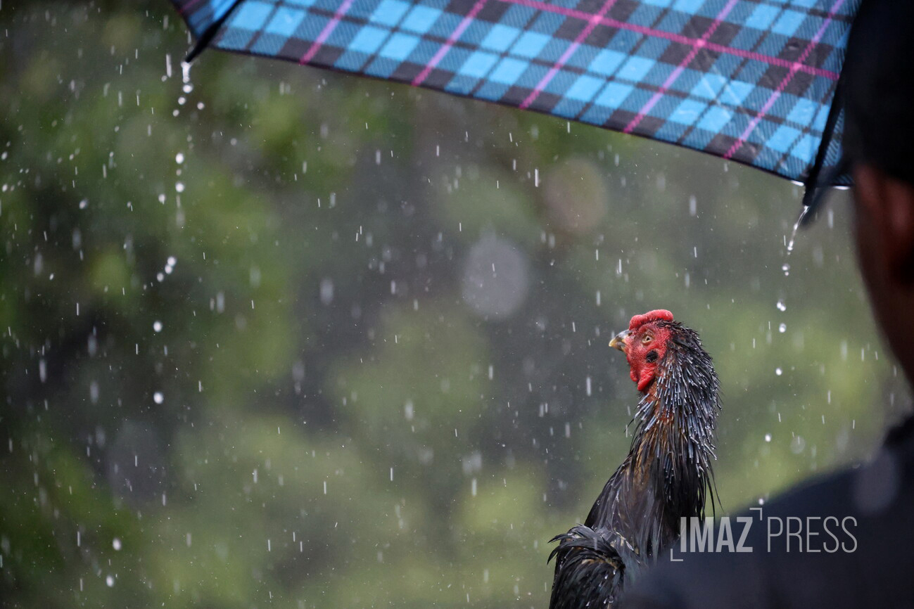 Alors il s'est dressé sur ses ergots, s'est planté face aux nuages et a vociféré un cocorico des plus menaçants. Celui qui veut dire : "eh oh, la pluie, si cela tu n'arrêtes pas de suite, je vais régler le problème à ma façon !".