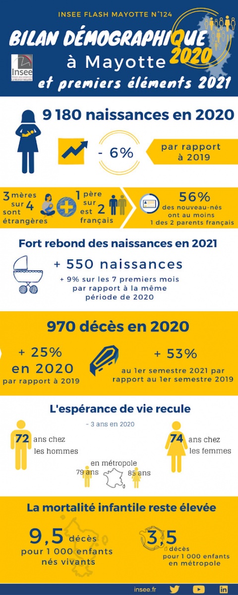"La pandémie de Covid-19 a un net effet sur la hausse du nombre de décès àMayotte. Ainsi, en 2020, le nombre de décès augmente davantage à Mayotte(+ 25 % par rapport à 2019) qu’en France métropolitaine (+ 9 %) ; uneépidémie de dengue a également touché l’île début 2020. Sur les six premiersmois de 2021, 610 personnes sont décédées, soit une hausse de 53 % parrapport à la même période de 2019, en lien avec le pic de la pandémie deCovid-19 intervenu en février 2021" note l'Insee.