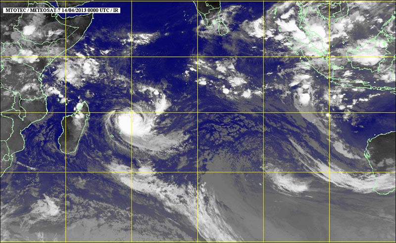 "Imelda, redevenu cyclone tropical, était centré à 16h locales ce dimanche 14 avril à 555 km au nord-est de La Réunion, par 17 degrés 9 Sud et 59 degrés 9 Est. Il se déplaçait en direction du sud-est à 17 km/h. La ré-intensification amorcée hier matin s'est poursuivie ce dimanche, amenant Imelda à être reclassé en cyclone tropical en milieu de journée. Le météore est désormais proche de son maximum (absolu) d'intensité, qu'il devrait atteindre cette nuit de dimanche à lundi.