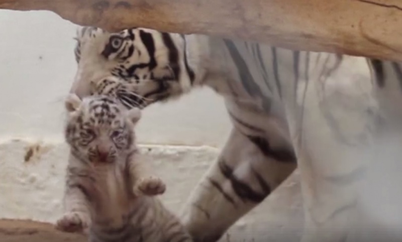 Deux petits tigres blancs du Bengale ont été présentés au public un mois après leur naissance, au zoo de Juarez situé au Mexique. Dorlotés par leur mère, les bébés font leurs premiers pas.