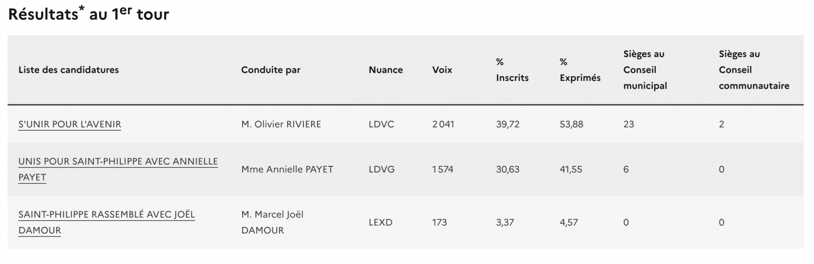 En 2020, Olivier Rivière a remporté les élections à Saint-Philippe avec 51,78 % des votes face à Wilfried Bertile et Yohan Cervantes.