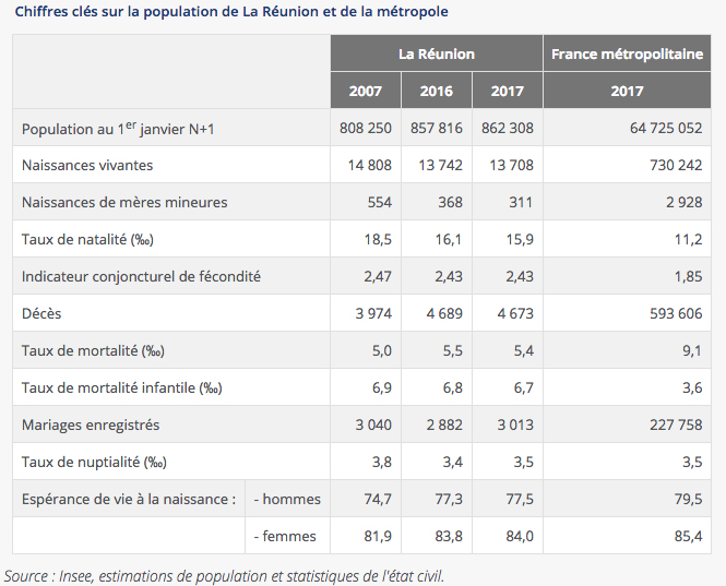 Avec 2,43 enfants par femme, la fécondité est nettement plus élevée à La Réunion qu’en métropole (1,85). Elle est même la plus élevée des régions françaises, après Mayotte et la Guyane. Elle reste stable depuis le début des années 1990, alors qu’elle baisse au niveau national depuis 2011.