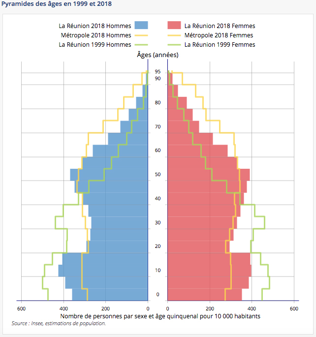 En lien avec la croissance de l’espérance de vie, la population réunionnaise vieillit : en 2018, 17 % de la population réunionnaise a 60 ans ou plus, contre 9,5 % vingt ans plus tôt. Elle reste cependant jeune par rapport à la métropole et aux Antilles : ainsi, les moins de 20 ans forment 31 % des habitants de l’île : ils sont encore deux fois plus nombreux que les seniors. En métropole, les seniors sont aussi nombreux que les jeunes : ils représentent chacun environ un quart de la population.