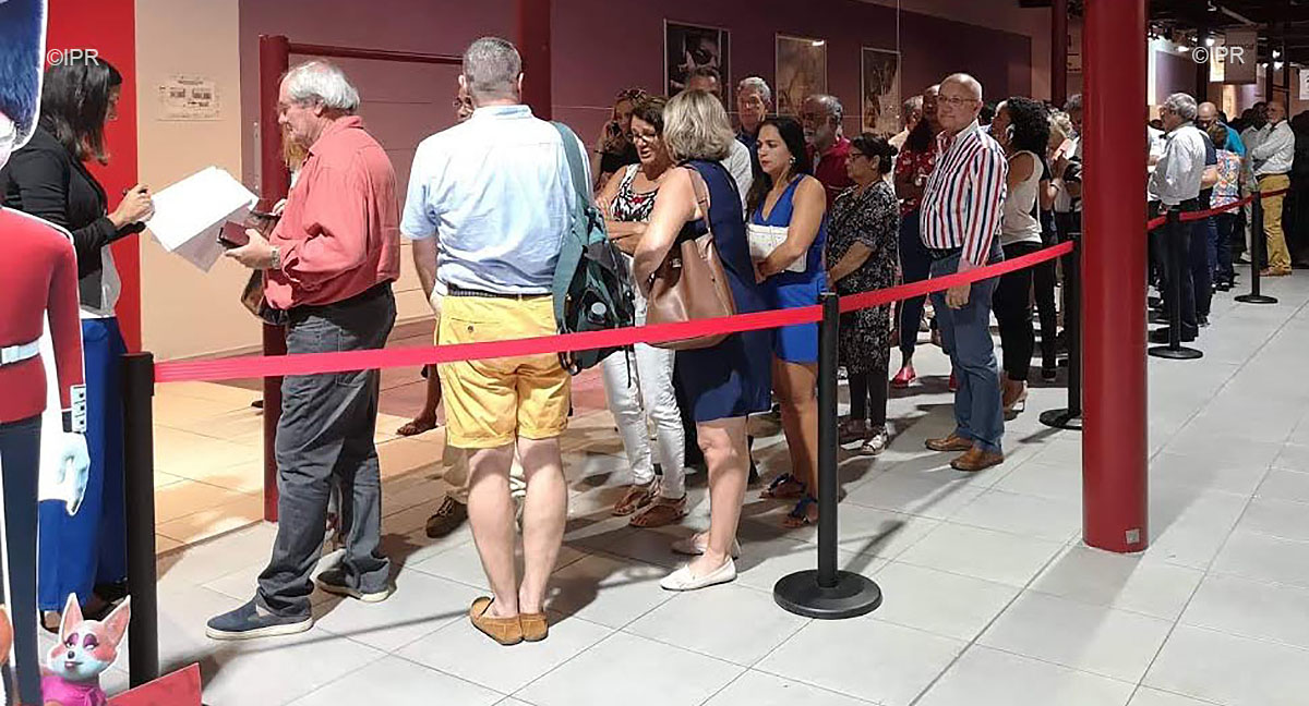 Grande file d'attente devant le Ciné-Palmes à Sainte-Marie où Nathalie Loiseau doit tenir un meeting. Parmi les personnalités on reconnaît le sénateur Michel Dennemont.