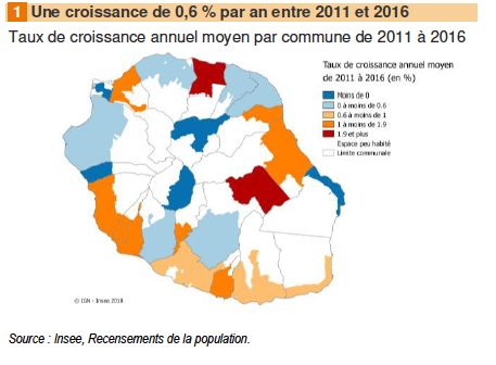 La croissance de la population réunionnaise entre 2011 et 2016 se place notamment derrière celle de Mayotte (+ 3,8 % par an en moyenne de 2012 à 2017), de la Guyane (+ 2,5 %) et de la Corse (+ 1,0 %). Aux Antilles, la Martinique perd des habitants (- 0,8 %), tout comme la Guadeloupe (- 0,5 %).