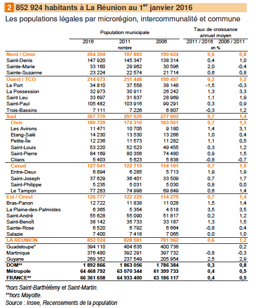 Au 1er janvier 2016, 852 924 personnes résident à La Réunion. La population progresse de 0,6 % par an depuis 2011, plus vite qu'en France métropolitaine (+ 0,4 %). La croissance démographique est portée par le solde naturel, marqué par un excédent des naissances sur les décès. Elle est freinée par des départs à présent plus nombreux que les arrivées. La croissance démographique de l'île est ainsi deux fois moins forte qu'entre 2006 et 2011. Elle s'infléchit dans la majorité des communes, et la population baisse même dans cinq d'entre elles. L'Ouest est la microrégion où la croissance est la plus faible entre 2011 et 2016, avec un ralentissement plus marqué qu'ailleurs. Nous publions le communiqué.