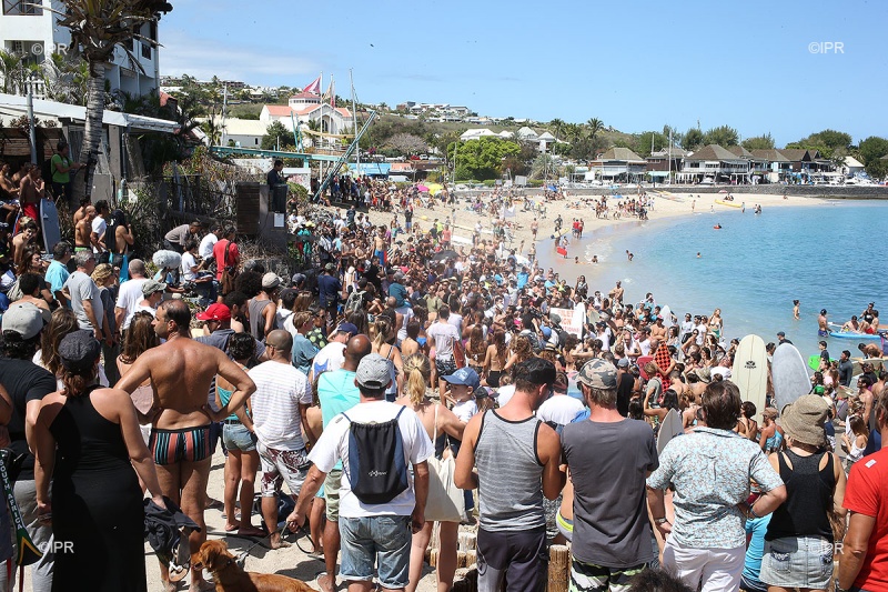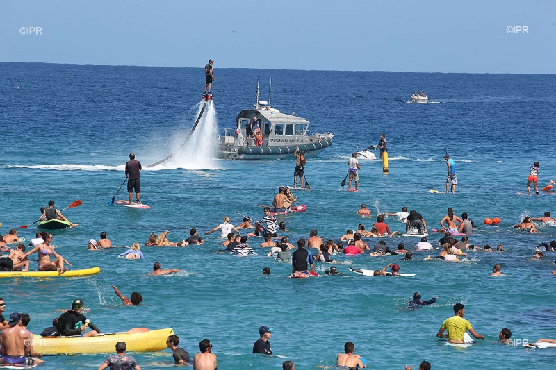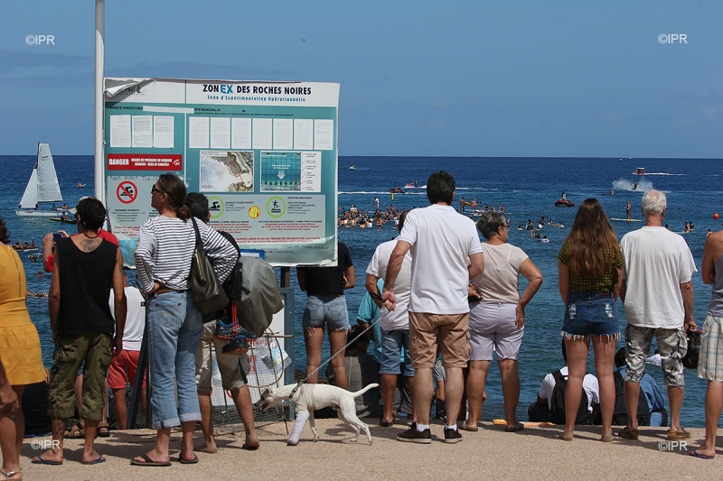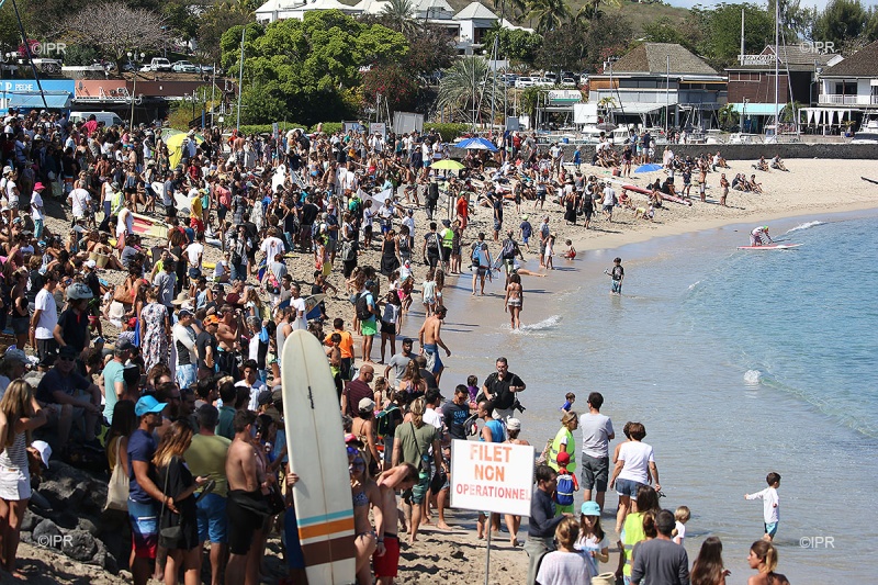 Une large partie de la foule est assise sur la plage. La situation est semblable à celle d'avant la crise requin (2011) pendant laquelle la plage des Roches Noires était très fréquentée, serviettes de bains et parasols en moins.