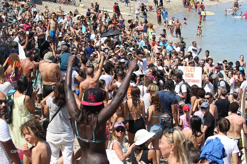 • 11h15 - Après demi-heure de baignade, le rassemblement touche à sa fin. Jean-François Nativel, initiateur du mouvement, a appeler les usagers à sortir de l'eau. Malgré quelques protestations, la majorité des participants ont rejoint la plage. Quelques planches sont encore visibles tout au bord du rivage.