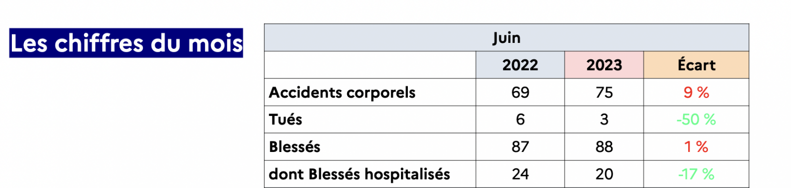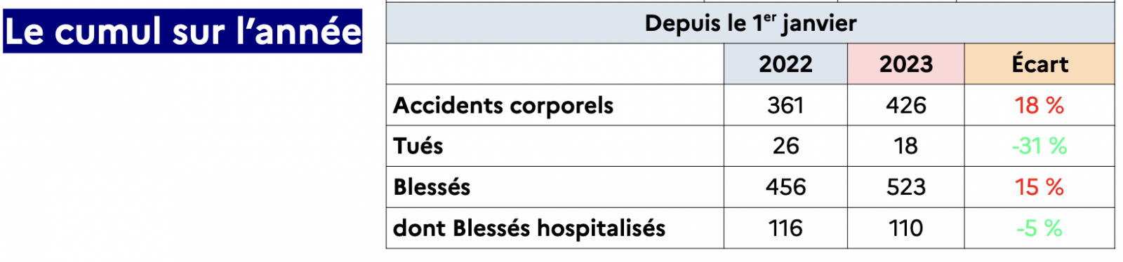 Depuis le 1er janvier 2023, ce sont 426 accidents corporels qui ont eu lieu (contre 361 l'année passée), soit une hausse de 18%. 18 personnes tuées, 523 blessés dont 110 hospitalisés.