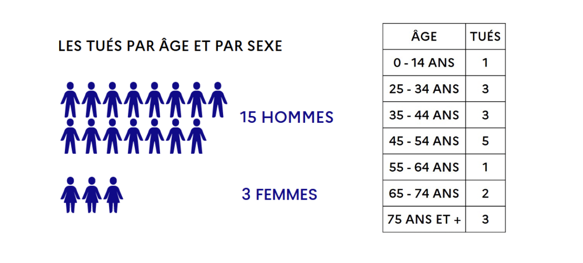 Parmi les décès à déplorer depuis le début de l'année, une personne avait moins de 14 ans. 15 hommes ont perdu la vie et trois femmes. La majorité ayant entre 45 et 54 ans.
