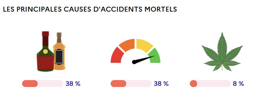 Dans ces accidents, l'alcool y est le facteur principal pour 38%, 38% également pour la vitesse et 8% pour les conduites sous stupéfiants.