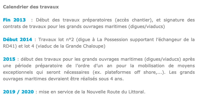 Internet n'oublie jamais, et tout particulièrement quand les modérateurs d'un site oublie d'en retirer une page. En date de 2014, ce calendrier de l'avancée des travaux de la Nouvelle route du littoral sur le site de la Région n'est vraisemblablement pas à jour... Car la NRL, toujours désespéramment en travaux à l'heure actuelle, est indiquée comme devant être livrée en 2020. (Photo d'illustration rb/www.ipreunion.com)