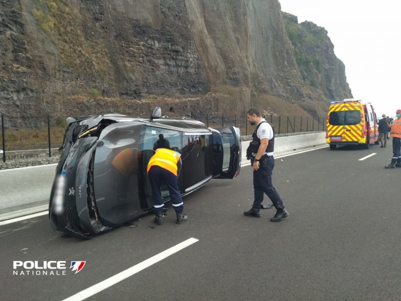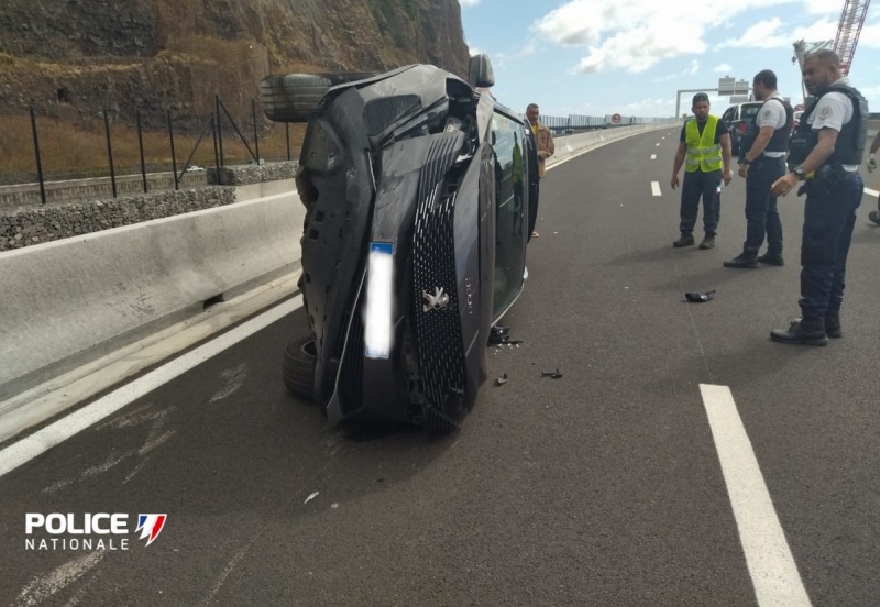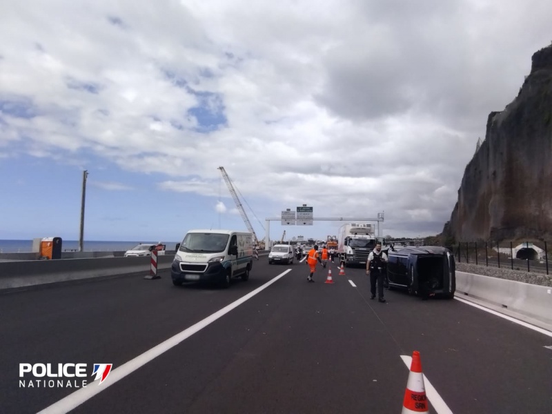 Un accident est survenu sur le viaduc de la nouvelle route du littoral (NRL) aux alentours de 13h50 ce mercredi 31 août 2022, en direction de La Possession. L'accident, le premier à se produire sur cet axe de circulation, implique un camion et une voiture. Ces derniers ont été retirés des voies de circulation. La voiture se trouvait sur le flanc, sur la voie de gauche. Le camion lui était en travers de la route. Bien que l'accident soit terminé, près de 10 km d'embouteillage cumulés (5 sur le Barachois, 5 sur le boulevard sud) sont recensés pour le moment. (Photos : Police de La Réunion)